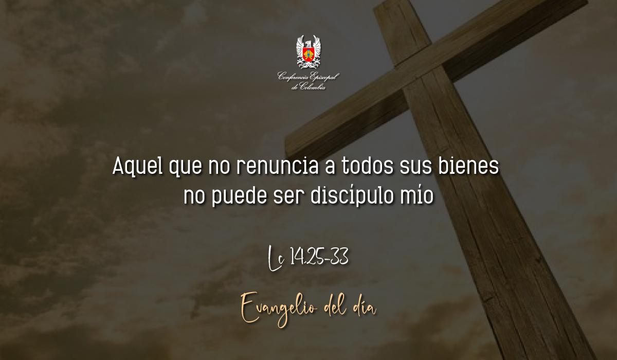 Lc 14,25-33Aquel que no renuncia a todos sus bienes no puede ser discípulo míoLectura del santo Evangelio según san Lucas.EN aquel tiempo, mucha gente acompañaba a Jesús; él se volvió y les dijo: «Si alguno viene a mí y no pospone a su padre y a su madre, a su mujer y a sus hijos, a sus hermanos y a sus hermanas, e incluso a sí mismo, no puede ser discípulo mío. Quien no carga con su cruz y viene en pos de mí, no puede ser discípulo mío. Así, ¿quién de ustedes, si quiere construir una torre, no se sienta primero a calcular los gastos, a ver si tiene para terminarla? No sea que, si echa los cimientos y no puede acabarla, se pongan a burlarse de él los que miran, diciendo: “Este hombre empezó a construir y no pudo acabar”. ¿O qué rey, si va a dar la batalla a otro rey, no se sienta primero a deliberar si con diez mil hombres podrá salir al paso del que lo ataca con veinte mil? Y si no, cuando el otro está todavía lejos, envía legados para pedir condiciones de paz. Así pues, todo aquel de entre ustedes que no renuncia a todos sus bienes no puede ser discípulo mío».Palabra del Señor.
