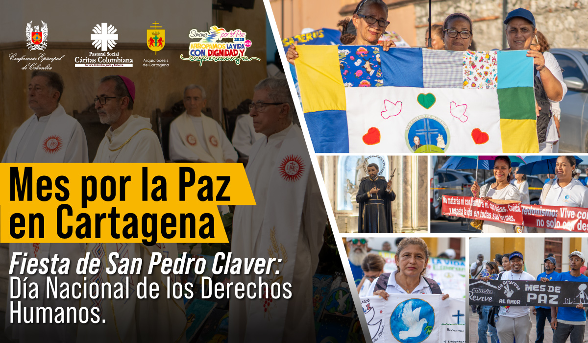 Con una multitudinaria caminata y una Eucaristía presidida por monseñor Francisco Javier Múnera Correa, la Arquidiócesis de Cartagena vivió una jornada de profundo significado espiritual y social este 9 de septiembre. En la fiesta litúrgica del patrono de los Derechos Humanos, Día Nacional de los Derechos Humanos y en el marco de la 38ª Semana por la Paz –extendida a Mes por la Paz–, la ciudad portuaria se convirtió en epicentro de esperanza y de un llamado contundente a no acostumbrarse a las injusticias que aún laceran a Colombia.La jornada inició con una simbólica caminata por la paz que partió desde el Colegio Salesiano. Cientos de personas, agentes pastorales, representantes de instituciones educativas, públicas, privadas y de la sociedad civil, portaron como estandarte una “colcha de la paz”, un vasto telar compuesto por retazos que narraban historias de perdón, resiliencia y anhelo de reconciliación desde diversos territorios.Este colorido mosaico de esperanza encontró su destino en la Iglesia de San Pedro Claver, donde monseñor Francisco Javier Múnera Correa, Arzobispo de Cartagena y Presidente de la Conferencia Episcopal de Colombia, presidió una solemne Eucaristía.Un legado que interpela el presenteInspirándose en el legado del “esclavo de los esclavos”, en su homilía, el presidente del Episcopado Colombiano trazó un paralelo entre la obra del santo jesuita del siglo XVII y las “nuevas formas aberrantes de esclavitud” del presente.“San Pedro Claver nos enseñó que la caridad ayuda a comprender la verdad, y que la verdad exige gestos concretos de caridad”, afirmó, citando las palabras del Pontífice.Con firmeza, señaló que el legado de quien restauró la dignidad de los esclavizados africanos exige hoy una acción decidida: “No podemos normalizar —con nuestros silencios o indiferencias— las formas de esclavitud que todavía pasan ante nuestras miradas… la trata de personas, el trabajo forzado, la violencia sexual, el reclutamiento de menores y todas las expresiones de exclusión y marginación”.Monseñor Múnera enfatizó que la paz solo se alcanza mediante “la misericordia activa y el compromiso con la justicia” para “desenredar la compleja madeja de los desencuentros”.“La exigencia de construir la paz pasa por ser firmes en los principios innegociables, pero siempre caritativos. Esa fue la pedagogía de Pedro Claver: hablar con las manos, actuar con las obras, tocar la carne herida del hermano”, subrayó.Voces que tejen esperanzaLos testimonios de los laicos participantes dieron cuerpo y alma a este mensaje episcopal. Nancy Herrera Méndez, del barrio El Pozón, explicó el sentido de la colcha de la paz: “Refleja la paz, el amor, la esperanza… Queremos que haya estos tres valores para que no haya tanta muerte, tanta violación de niños, de mujeres, de secuestro, de desplazamiento. No queremos más guerra, queremos la paz”.Por su parte, Edwin Javier Arrieta Jiménez vio en la actividad “una oportunidad de expresar (…) Todo lo que tiene que ver con la unión y la fraternidad. Esto simboliza el sanar heridas, el reconciliar corazones, el estrechar nuevamente brazos”.Beatriz Salas, feligrés participante, destacó la dimensión nacional y continua del esfuerzo: “Cumplimos 38 años de estar conmemorando la Semana por la Paz… Vamos a continuar con una agenda muy nutrida, partiendo especialmente de la cultura del encuentro y continuar escuchando las voces de los que no tienen voz”.Un compromiso que trasciende lo conmemorativoLa celebración no se limitó a los actos litúrgicos. Frente al altar del Santuario, se exhibieron cuadros de la iniciativa Artepaz, elaborados por jóvenes de 17 instituciones educativas, que plasmaron su anhelo de paz desde la creatividad y la sensibilidad adolescente.Al finalizar, la consigna que el Papa Francisco dejó en 2017 y que monseñor Múnera reiteró resonó con fuerza en el claustro colonial, sellando un compromiso que busca ir más allá de un día de conmemoración: “Pedro Claver nos dejó la consigna a todos los colombianos: ser esclavos de la Paz para siempre”. Un llamado a que la fiesta despierte el deseo de entrega y servicio, inspirando a una nación entera a ser generadora de paz y sembradora de esperanza.Vea el informe audiovisual a continuación: